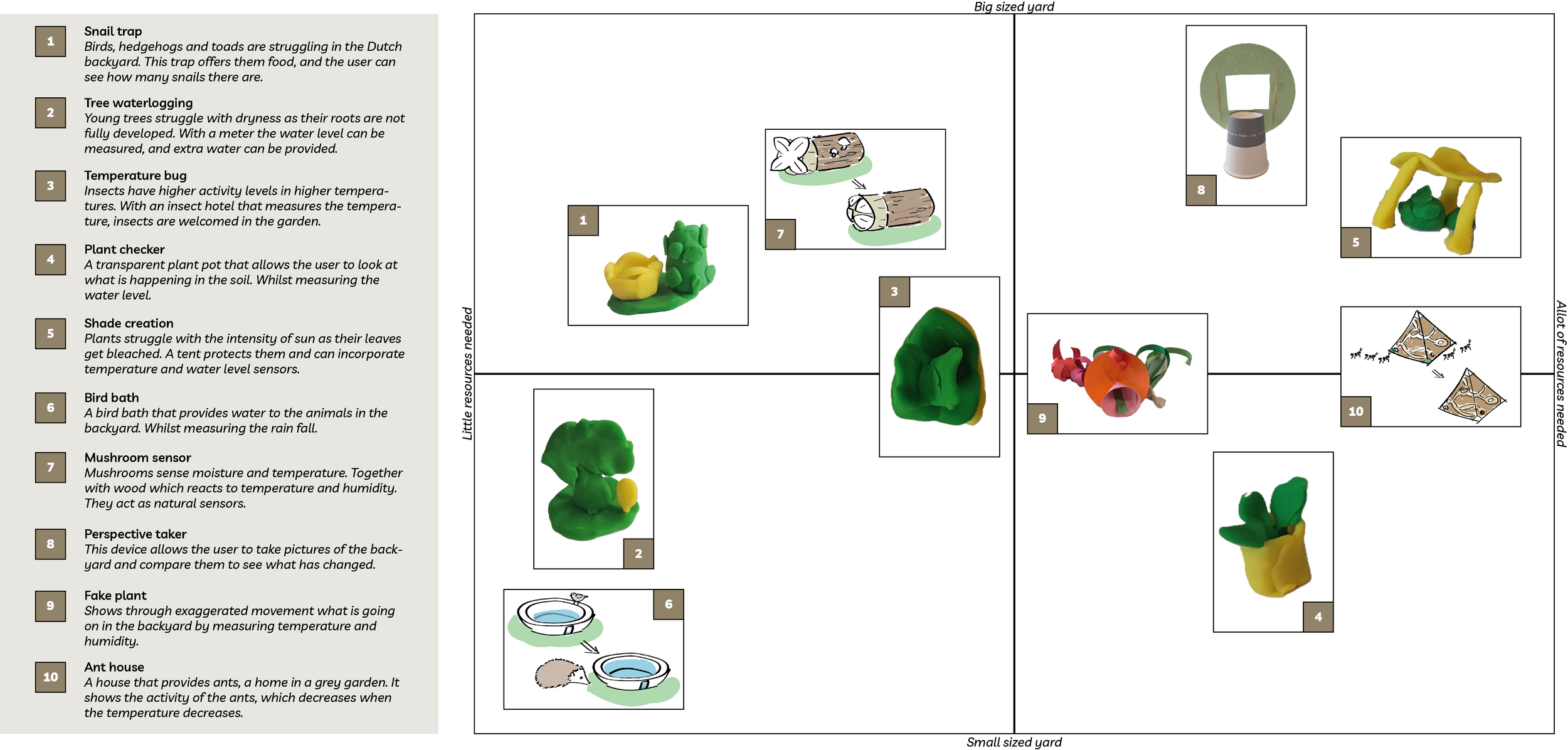 In my design process I explored how climate change effects the backyard. Through literature and an autoethnographic study. I also explored different sizes of backyards, as well as different resources and skill levels users have. Ten concepts were developed through iteration and a workshop with designers. From these concepts the mushroom sensor was chosen to be develop further as it looked at a variety of data and could be used in most gardens.
