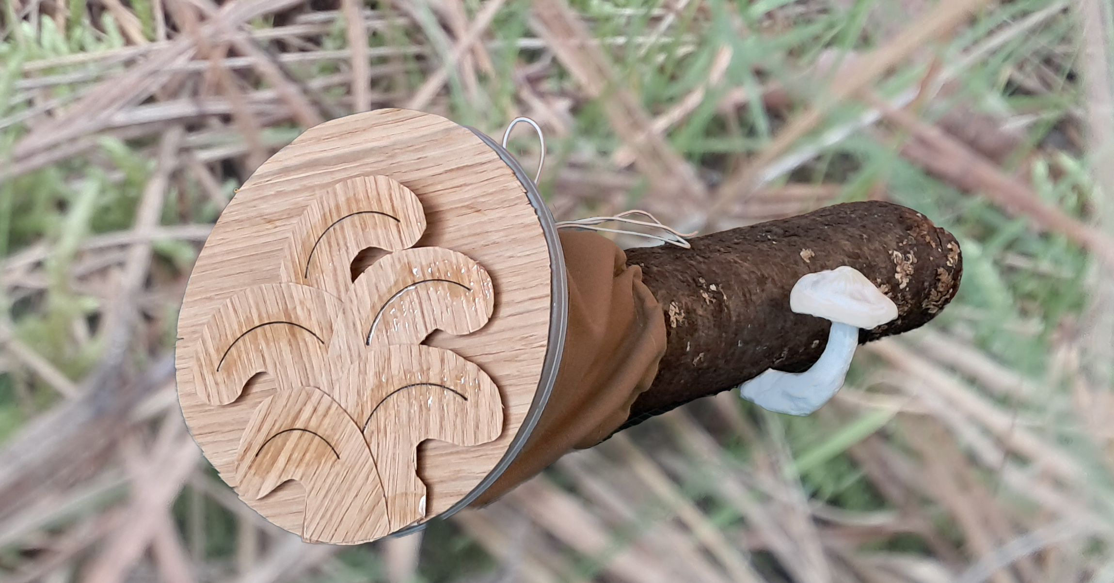 The mushroom sensor is a log of wood on which mushrooms can grow. They like moisture and a warm ground temperature and they dislike frost. Therefore, mushrooms act as a natural sensor. On the log is a cap that has veneer wood on it. The wood reacts to humidity and temperature which makes it flex and shrink. Inside the cap are sensors which measure humidity and temperature more precisely. It is companied by a digital platform, on which the long-term data is presented, and climate adaptation tips are given. These together allow the user to see how climate change effects their backyard.