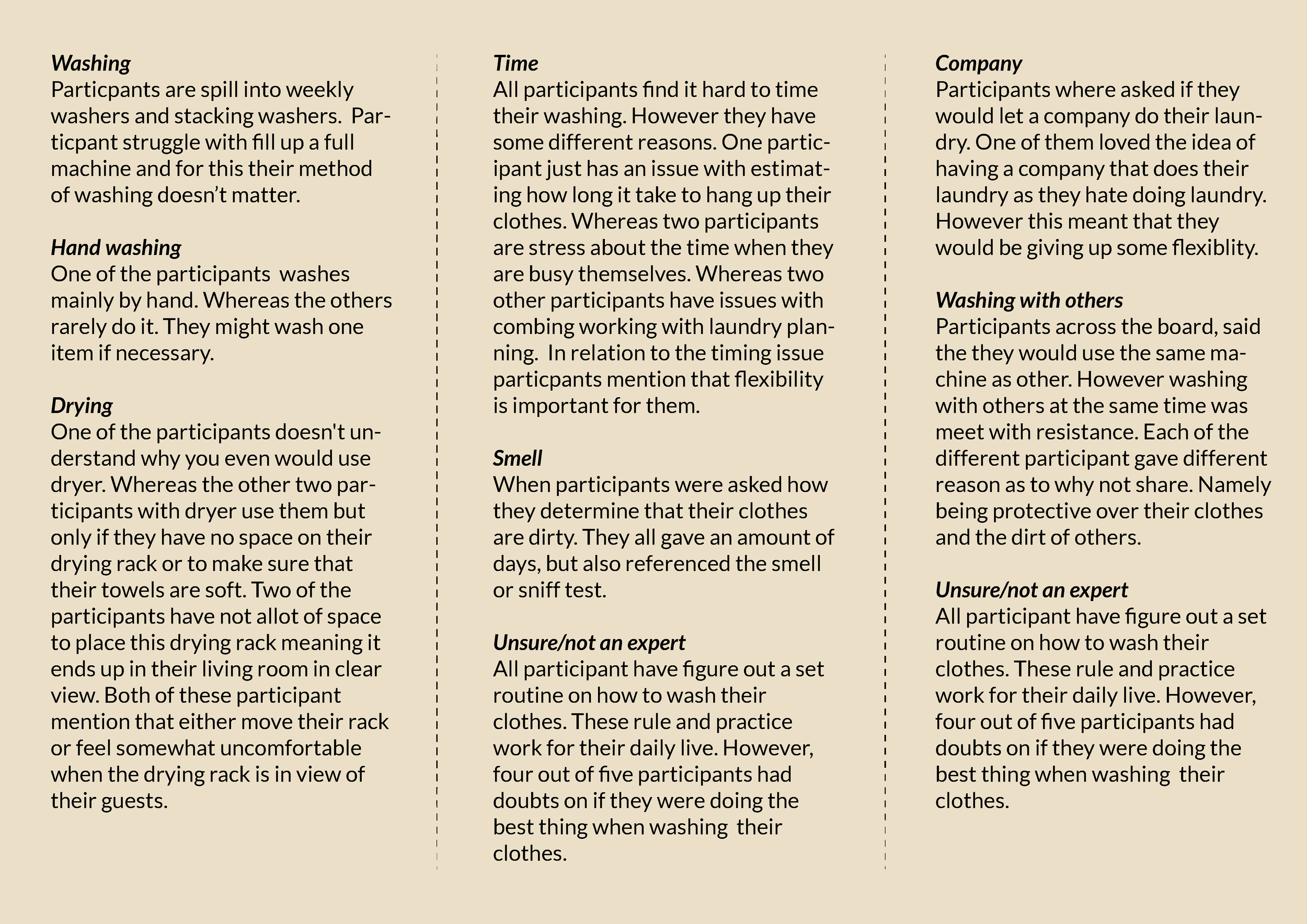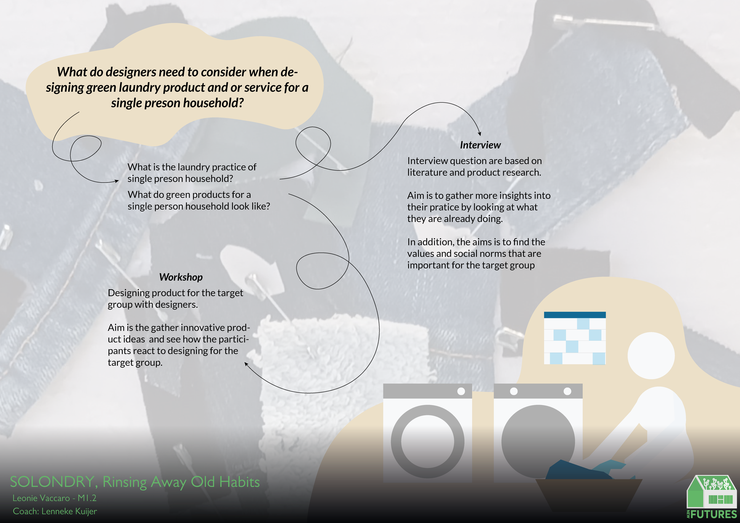This research explores the question: What do designers need to consider when designing green laundry products and services for single-person households? To answer this, interviews were conducted with single-person households to uncover their laundry practices, values, and norms. Key insights include the difficulty of timing laundry, the reluctance to share machines due to privacy concerns, and a reliance on smell to determine cleanliness. These findings informed a workshop where designers created four concepts addressing or challenging these issues and norms. The results highlight the potential for innovative solutions that either accommodate existing practices, such as washing machines with customizable compartments, or push boundaries, like designs that encourage shared usage or visible laundry displays. This research concludes that designing for single-person households requires balancing personalization with sustainability while addressing the unique challenges of living alone.