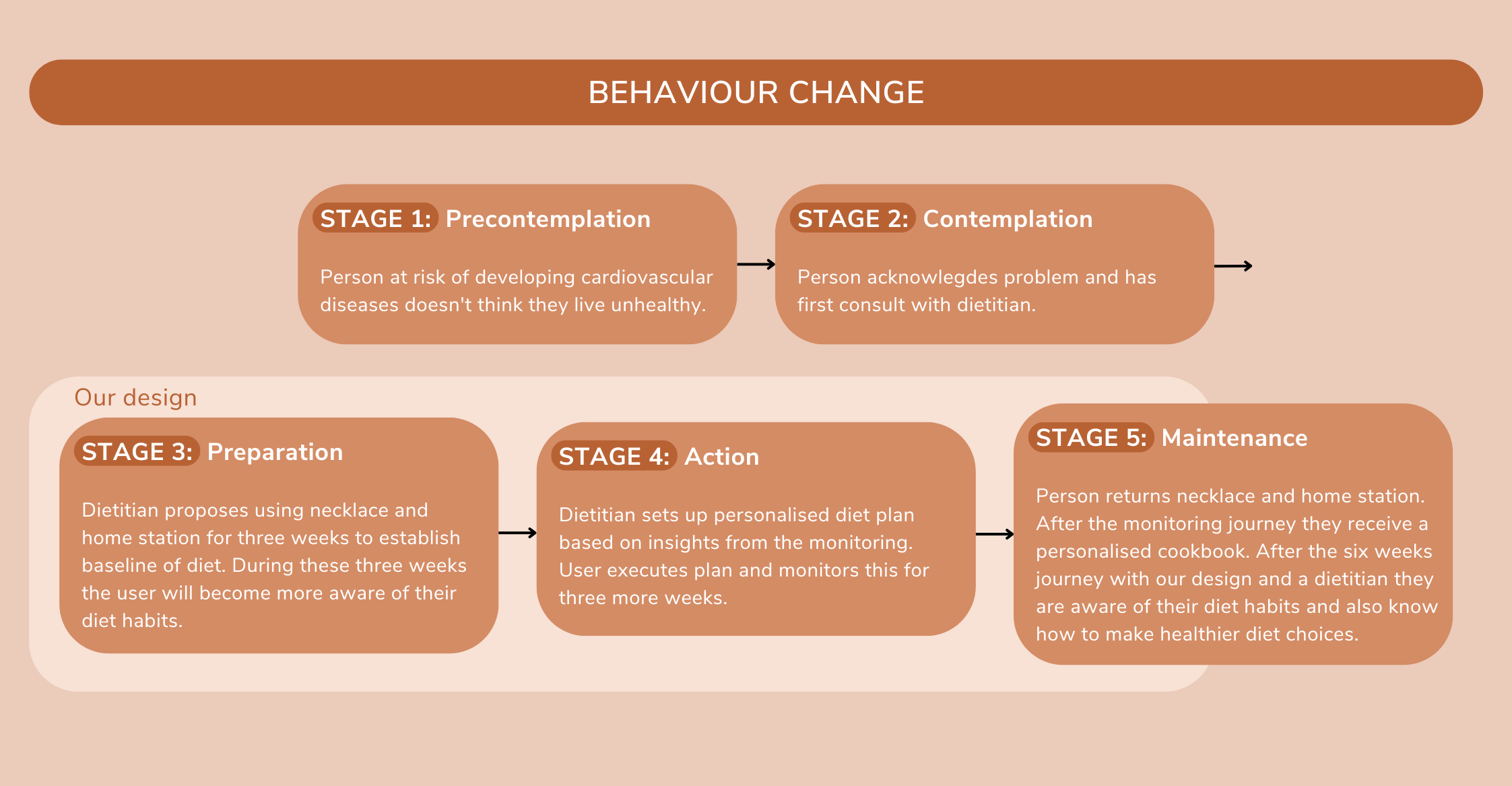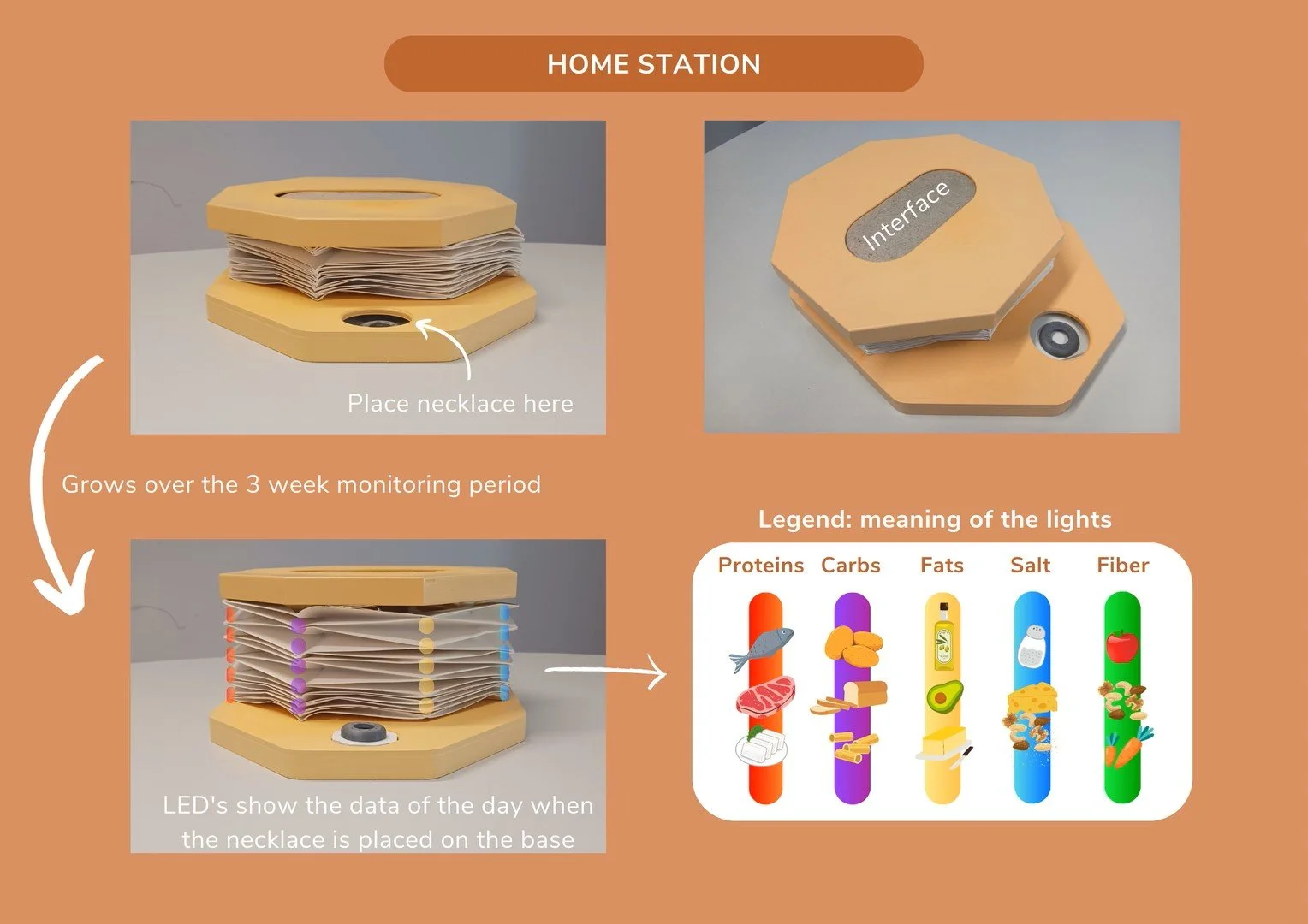 The necklace works together with a home station that has multiple functions. It is a charger for the necklace and storage unit for the data, it visualises the data with lights and it provides information and reflective questions on the interface on top. Both the necklace and home station will be provided by a dietitian. The home station starts off flat and grows during the three week monitoring period. The dietitian will develop a suitable diet plan based on the data collected by the user. The simplified daily monitoring together with the reflective questions aims to make the user more conscious about their lifestyle, mainly focused on a varied diet.